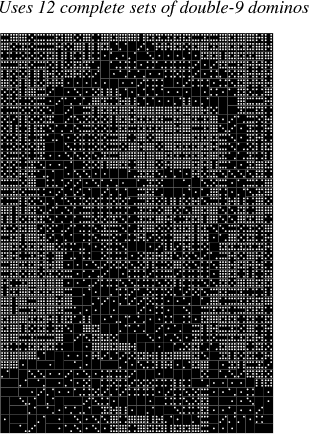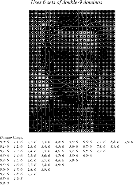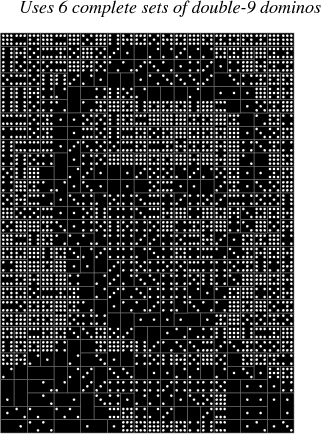 6 sets, 3 dominoes are not used to allow a better aspect ratio